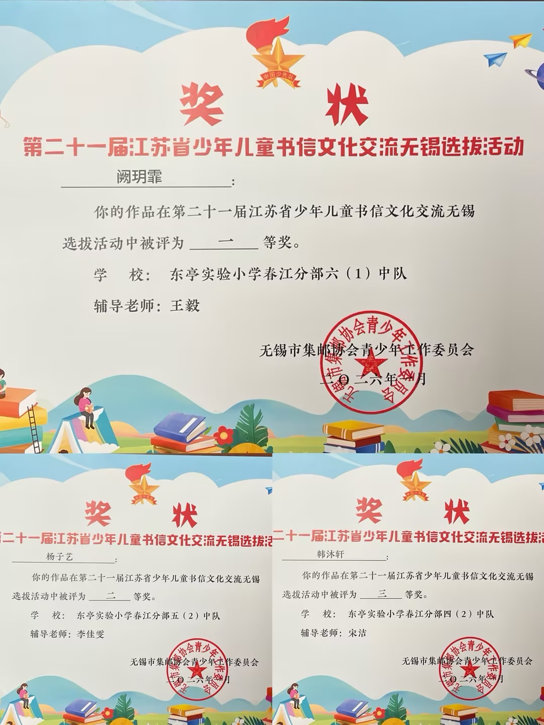 在第二十一届江苏省少年儿童书信文化交流无锡选拔活动中,阙玥霏、杨子艺、韩沐轩分获一、二、三等奖。